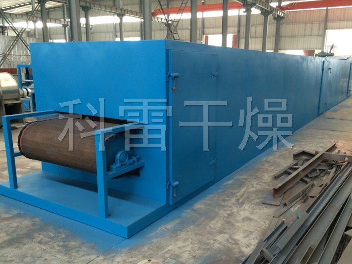 物料由加料器均勻地鋪在網(wǎng)帶上,網(wǎng)帶一般采用12-60目不銹鋼絲網(wǎng),由傳動(dòng)裝置拖動(dòng)在干燥機(jī)內(nèi)移動(dòng)。干燥機(jī)由若干單元組成,每一單元熱風(fēng)獨(dú)立循環(huán),部分尾氣由專(zhuān)門(mén)排濕風(fēng)機(jī)排出,廢氣由調(diào)節(jié)閥控制,熱氣由下往上或由上往下穿過(guò)鋪滿(mǎn)物料的網(wǎng)帶完成熱量與質(zhì)量傳遞的進(jìn)程,帶走物料水份。網(wǎng)帶緩慢移動(dòng),運(yùn)行速度可根據(jù)物料溫度自由調(diào)節(jié),干燥后的成品連續(xù)落入收料器中。上下循環(huán)單元根據(jù)用戶(hù)需要可靈活配備,單元數(shù)量亦可根據(jù)需要選取。